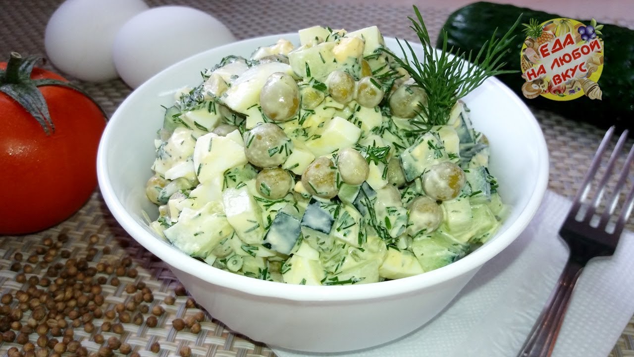 Простой Салат до Безумия - Никогда Не надоест! Ингредиенты:огурец свежий – 1 шт.,яйцо вареное – 4 шт.,горошек зеленый – 1 банка,зелень – ½ пучка,соль, перец молотый – по вкусу,майонез (сметана) – 1-2 ст.л.