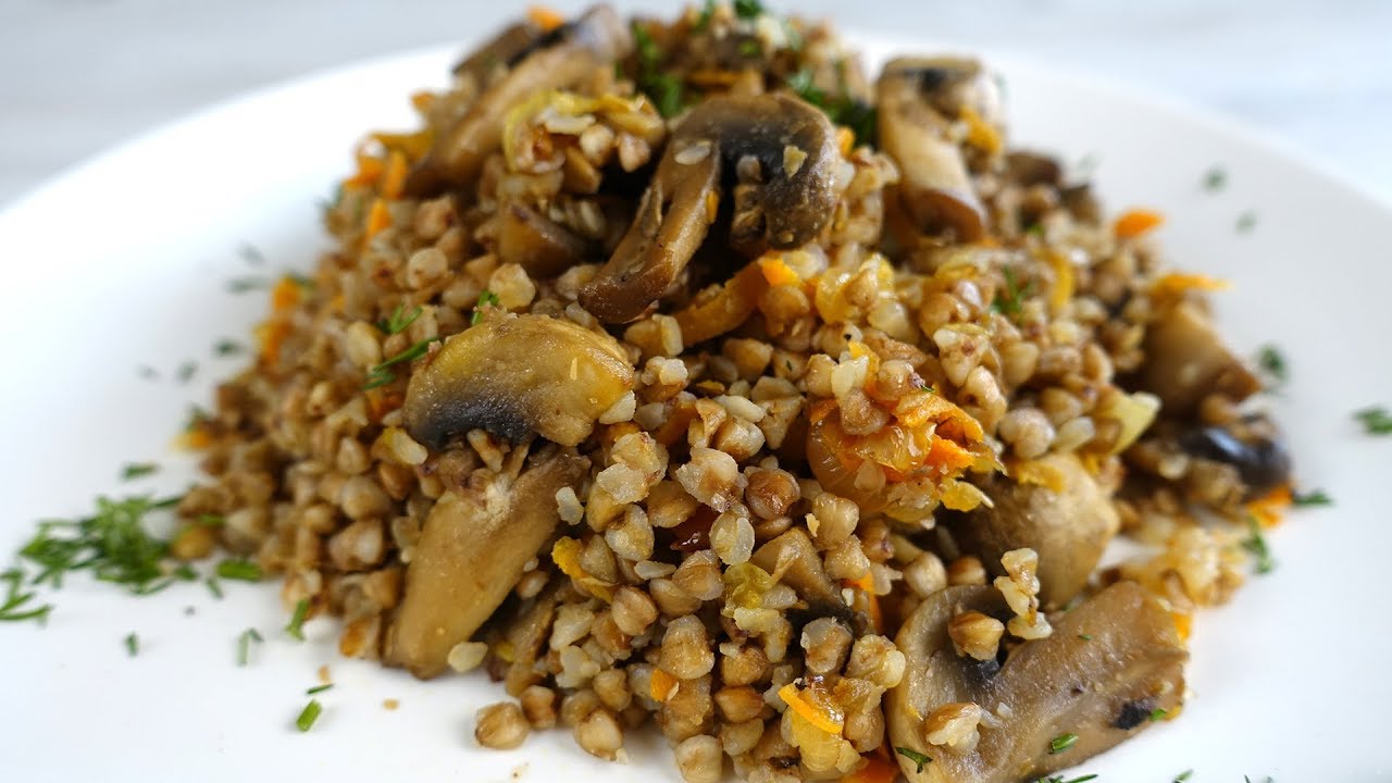 ТАКАЯ ГРЕЧКА С ГРИБАМИ ПОНРАВИТСЯ ДАЖЕ ДЕТЯМ Гречневая крупа - 250 мл.Вода для варкиШампиньоны свежие - 400 гр. (или замороженные)Морковь - 1 шт.Лук - 1 шт.Смесь растительного и сливочного масла для жаркиСоль, перец по вкусу
