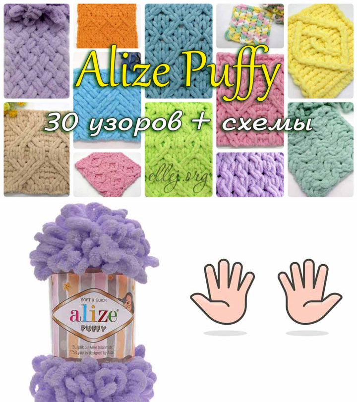 30 узоров и схем для вязания мягких плюшевых пледов из пряжи Alize Puffy пальчиками. Учимся вязать по схемам https://ellej.org/alize-puffy-basic/