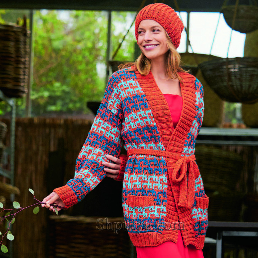 Яркий кардиган без застежки, с поясом и карманами, отделан по краям широкой резинкой и связан спицами чередованием узора со снятыми петлями с жаккардовым узором. В комплекте вязаная шапочка в цвет.