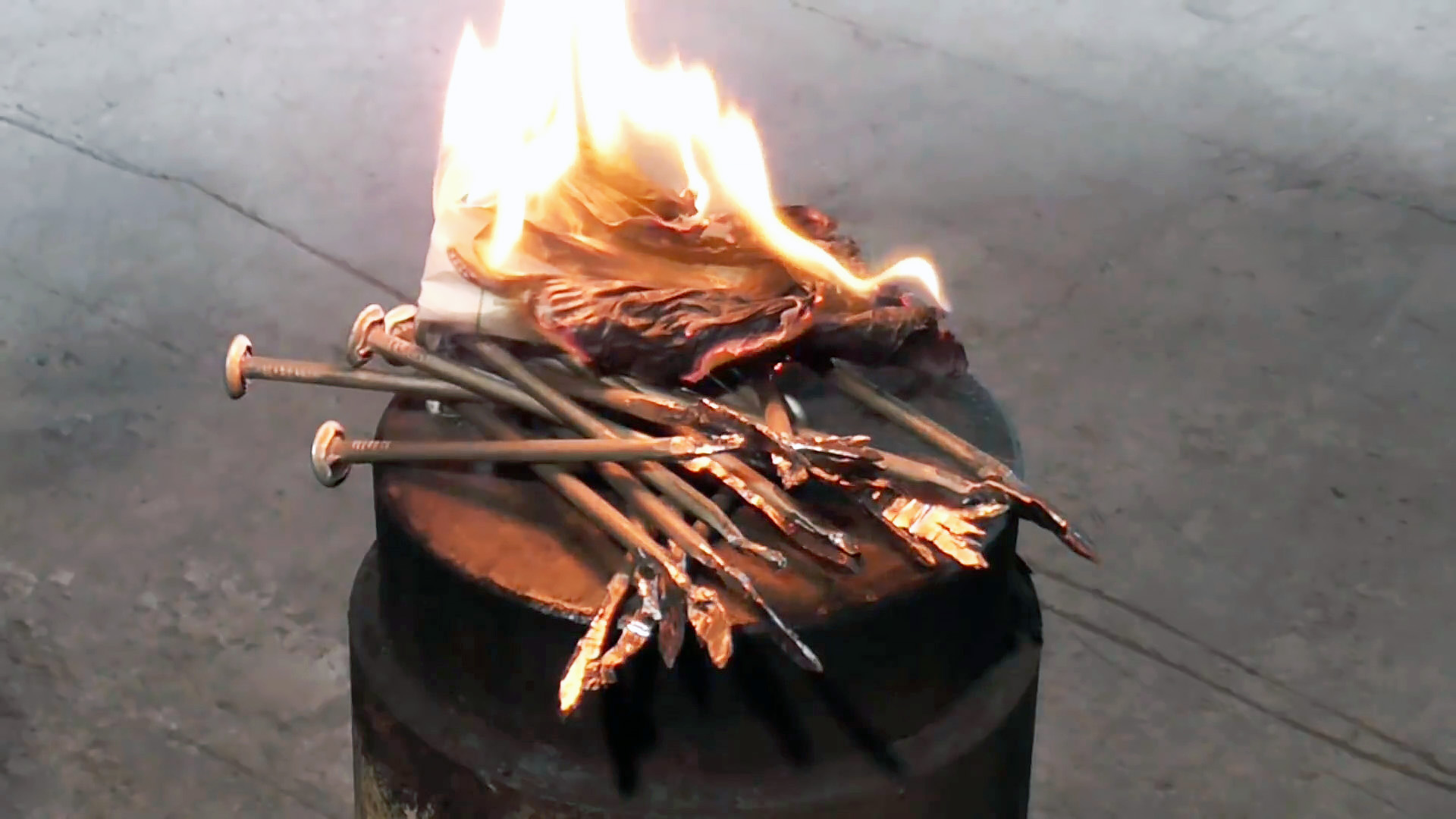 Как разжечь огонь при помощи обычного гвоздя Как разжечь огонь с помощью обыкновенного гвоздя, используя принцип перехода одного вида энергии в другой, и продемонстрировать это наглядно. Обыкновенный гвоздь со шляпкой, рисками на стержне под ней и, заостренный с одного конца, сделан практически из чистого железа и поэтому обладает прекрасной