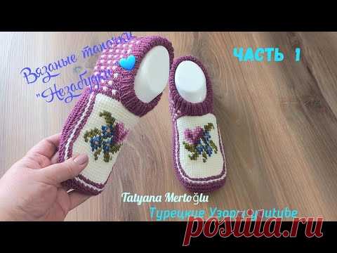 Вязаные тапочки "Незабудки"💙 Часть 1. раз.38/40 🧶тунисское вязание+спицы