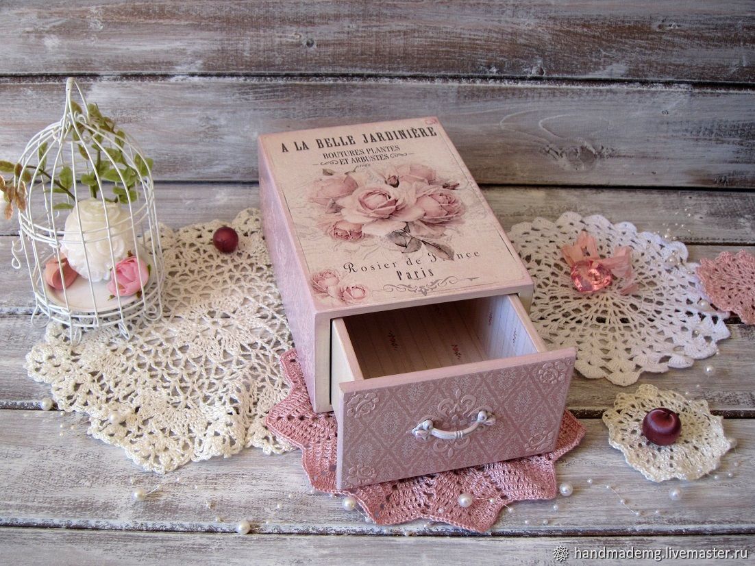 Красивая и нежная шкатулка-пенал, подойдёт к любому интерьеру. Шкатулка вместительная, ящик глубокий , легко выдвигается и его можно вынуть полностью, что очень удобно.