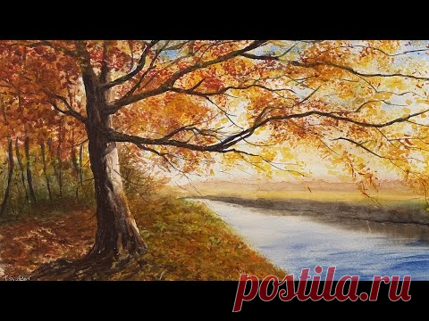 Как рисовать осеннее дерево акварелью. How to paint autumn tree with watercolour
