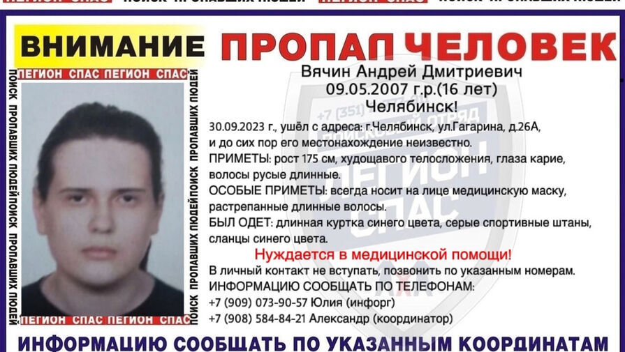 В Челябинске разыскивают подростка в медицинской маске. В Челябинске пропал 16-летний подросток. Объявление о поиске юноши разместили в группе поискового отряда "Легион - СПАС" во "ВКонтакте". Андрей Вячин 2007 года рождения пропал в Ленинском районе города еще 30 сентября. ...