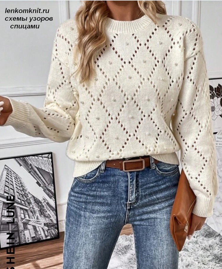 Ромбы с ажурным контуром. Схема узора - Вязание спицами LenkomKnit Ромбы с ажурным контуром. Краткий обзор модели, схема вязания спицами узора в виде ромбов с контуром из крупных отверстий (в двух вариантах)