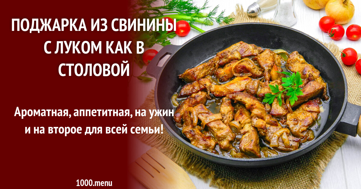 - Шаг 1: Как сделать поджарку из свинины как в столовой? Подготовьте продукты. Для жарки подходят не все части туши. Чтобы мясо получилось нежным и сочным берите шею, лопатку, окорок или вырезку. Вкуснее блюдо получится из свежего мяса, но если у вас замороженное, предварительно разморозьте его, оставив на 8 часов в холодильнике, потом 1-2 часа в комнате.Шаг 2: Мясо промойте и просушите бумажными полотенцами, чтобы при обжаривании было меньше брызг и на поверхности получилась более равномерная румяная корочка. Лишний жир срежьте.Шаг 3: Мясо нарежьте на кусочки размером примерно 2х4 см. Старайтесь нарезать куски поперек волокон — при жарке они сожмутся, но короткие будут мягче длинных.Шаг 4: Лук очистите, промойте и нарежьте полукольцами. В таком виде он сохранит форму и так его удобно будет есть.Шаг 5: Переложите в общую глубокую емкость мясо и лук. Добавьте специи и примерно 3 столовых ложки масла. Пока не солите. Мясо лучше не солить перед жаркой, чтобы сохранить больше сока. Специи берите по вкусу, готовые наборы или по отдельности.Шаг 6: Все тщательно перемешайте, чтобы каждый кусочек равномерно промариновался. Оставьте на 30 минут при комнатной температуре. Шаг 7: Для жарки разогрейте сковороду с растительным маслом. Учтите, что если мясо слишком жирное, то масла потребуется намного меньше, чем указано в рецепте. Иногда, если мясо жирное, можно обойтись и вовсе без масла. Включите средний или выше среднего огонь. Так как мясо жарится дольше лука, выложите на сковороду сначала только куски свинины в один слой. Если все сразу не помещается, жарьте в несколько заходов. Крышкой закрывать не нужно.Шаг 8: Выкладывайте свинину на сковороду по кусочку на расстоянии друг от друга. Обжаривайте с двух сторон до румяной корочки. У меня ушло на каждую сторону примерно по 4 минуты. Уже поджаренную сторону посолите.Шаг 9: Готовые кусочки выложите в глубокую посуду и накройте крышкой и дайте "отдохнуть", чтобы мясо дошло до готовности.Шаг 10: На оставшемся на сковороде от мяса масле пожарьте лук. Жарьте, пока он не станет прозрачным и золотистым.Шаг 11: Перед подачей мясо с луком перемешайте и слегка прогрейте на той же сковороде. Подавайте с картофельным пюре, макаронами, рисом или гречкой. Приятного аппетита!