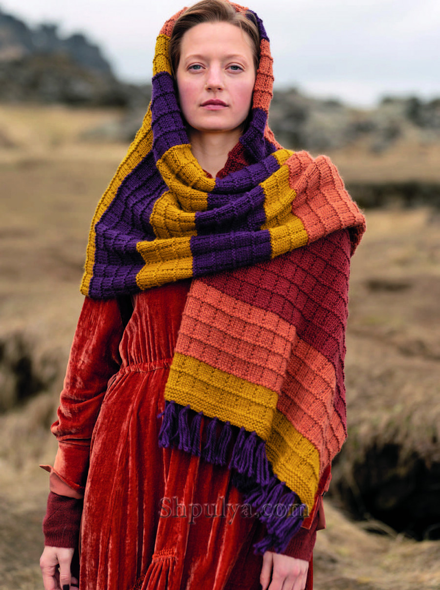 Теплый и уютный палантин из мягкой шерсти с шерстью альпака связан простым узором из лицевых и изнаночных петель и украшен кисточками по краям.