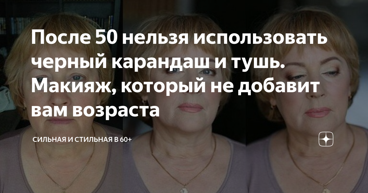 После 50 нельзя использовать черный карандаш и тушь. Макияж, который не добавит вам возраста Статья автора «СильнаЯ и СтильнаЯ в 60+» в Дзене ✍: Самой большой ошибкой женщин в возрасте 50+ является то, что они делают макияж точно так же, как делали 20 лет назад.