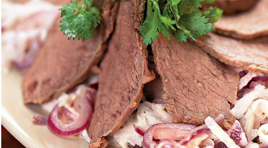- Отварную говядино нарежьте тонкими ломтиками.