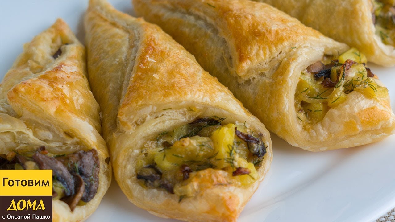 Неимоверно вкусная закуска с грибами. Грибные Кулёчки - обалденная выпечка из слоёного теста. ИНГРЕДИЕНТЫ:слоеное дрожжевое тесто - 500 гшампиньоны - 400 гукроп - пучоклук - 1 шткартофель вареный - 3 штсыр - 100 гяйца - 2 штсольрастительное маслочерный молотый перец