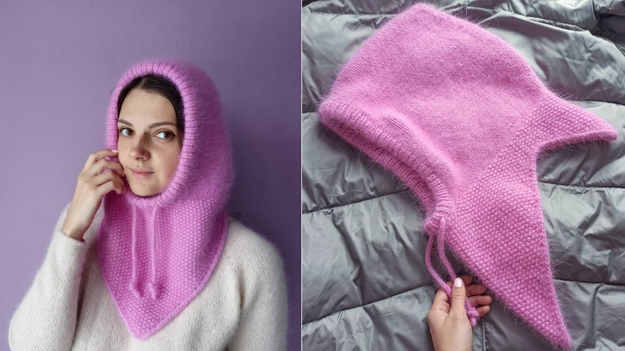 МК Капор спицами из пуха норки с большим треугольным снудом подробный МК