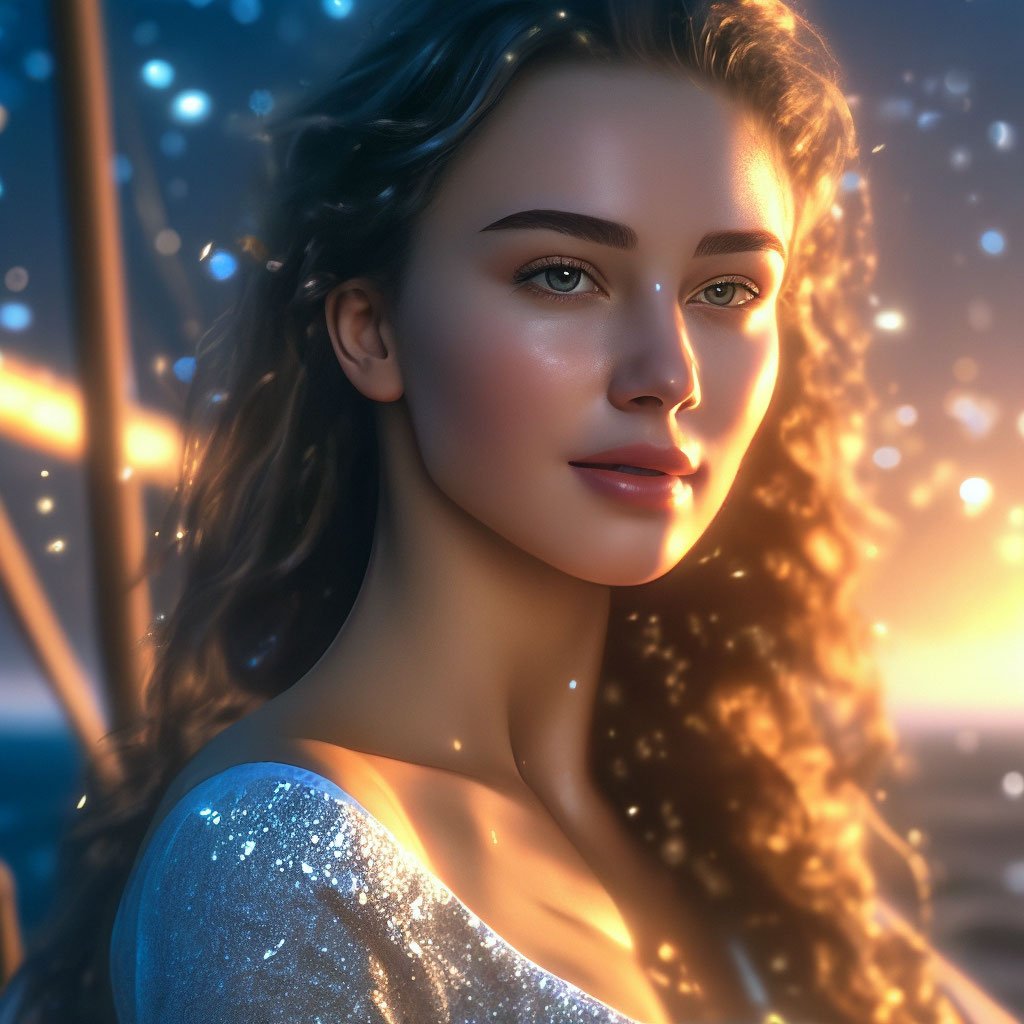 Нейросеть и очень красивая девушка, море и бригантина, мягкий свет, glitter, профессиональное фото, красиво, 3d, реалистично, 8k, высокое разрешение, высокая детализация, гипер-реализм,высоко-детализированная цифровая живопись, фото-реалистичная живопись, крупным планом, нуар , эстетично, яркое освещение