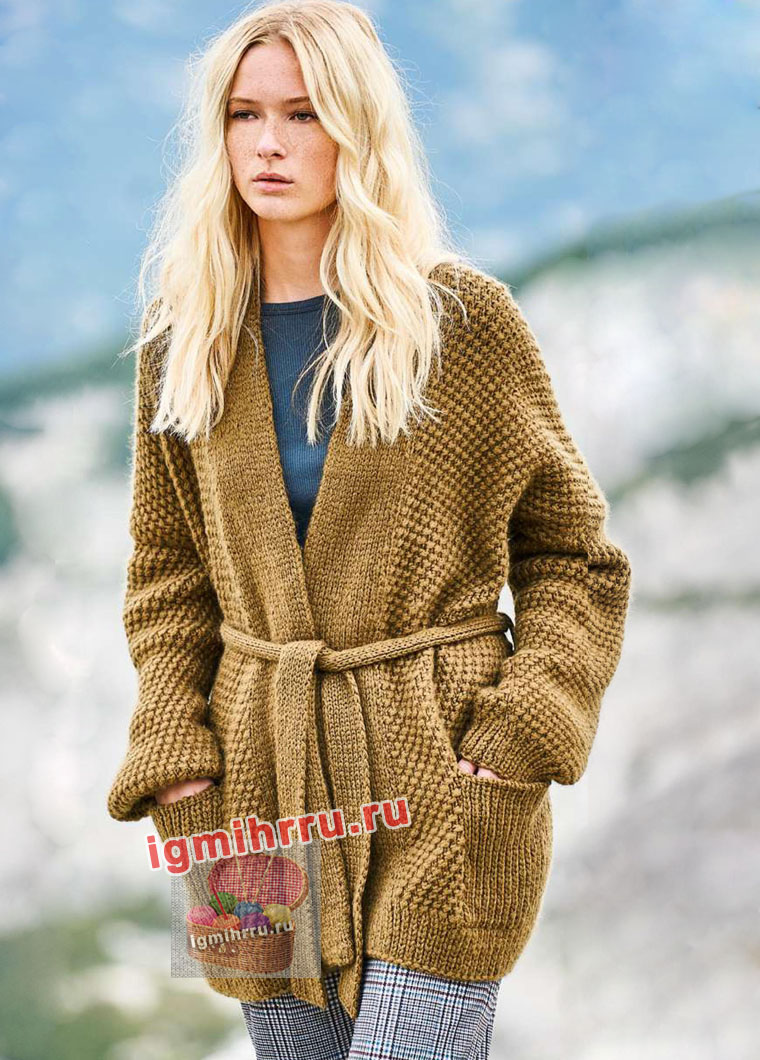 Шерстяной кардиган со структурным узором. Вязание спицами со схемами и описанием