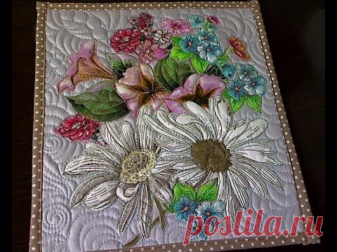 Цветочный квилт коллаж из остатков тканей в цветочек.. Рисунки свободно ходовой стежки.