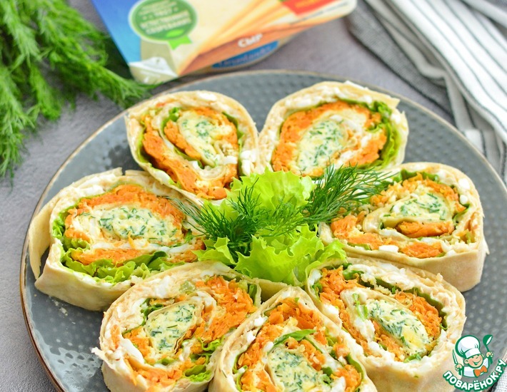 - Сырую морковь натрите на тёрке и спассеруйте на масле, слегка подсолив. Накройте крышкой и потушите до готовности 10 минут. Полностью остудите Отварной лосось разомните вилкой, белки вареных яиц натрите на терке, смешайте с майонезом, слегка подсолите. Сыр Грюнландер натрите на мелкой тёрке Желтки вареных яиц смешайте с нарубленным укропом и майонезом, слегка подсолите. Расстелите лист лаваша на рабочей поверхности, отрежьте край. Распределите по всему лавашу смесь лосося с белками. Затем выложите салатные листья. Сверху остывшую морковь. Посыпьте натёртым сыром. Отрезанный край лаваша положите сверху, намажьте на него массу из желтков с укропом. Сверните аккуратно всё в рулет. Если лаваш тонкий и рвётся, то оберните вторым листом лаваша. Есть можно сразу или выдержать в холодильнике пару часов.