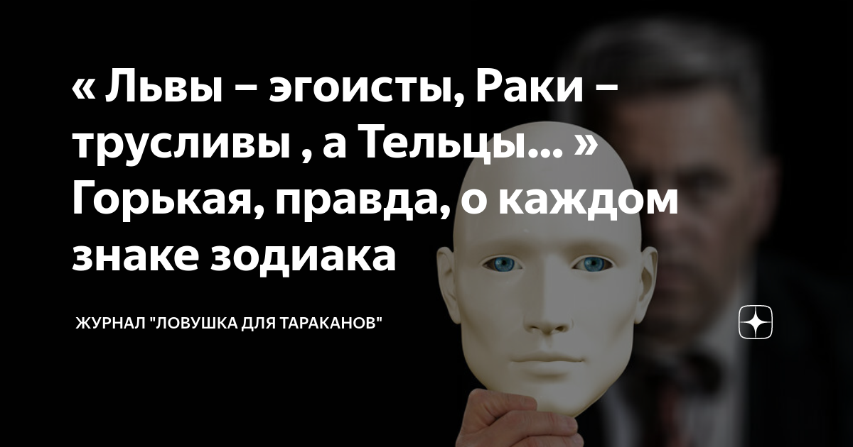 « Львы – эгоисты, Раки – трусливы , а Тельцы… » Горькая, правда, о каждом знаке зодиака Статья автора «Журнал ЛОВУШКА ДЛЯ ТАРАКАНОВ 4.2 » в Дзене ✍: Недостатки есть у всех, но, как же важно точно знать каких неприятностей не избежать при знакомстве с новым человеком.