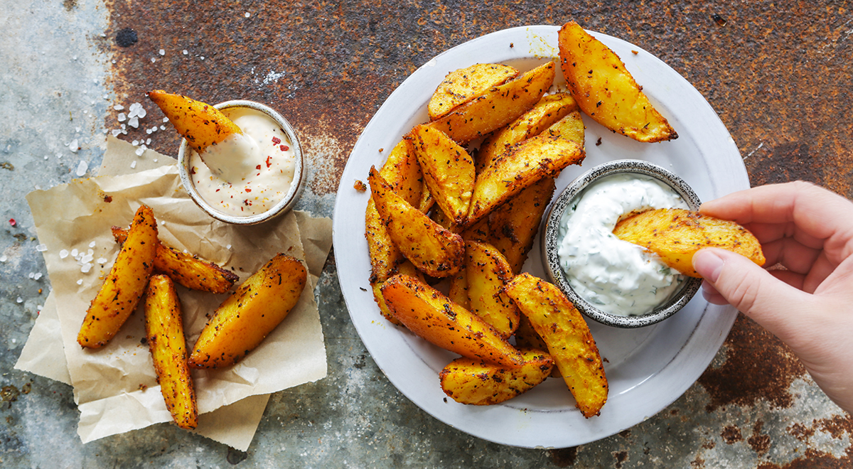 - Проверьте готовность картофеля деревянной шпажкой – дольки должны прокалываться без усилия. При необходимости запекайте картофель еще 5 мин. Выньте противень, разложите картофель в тарелки и подавайте горячим, с любым соусом по вашему выбору.