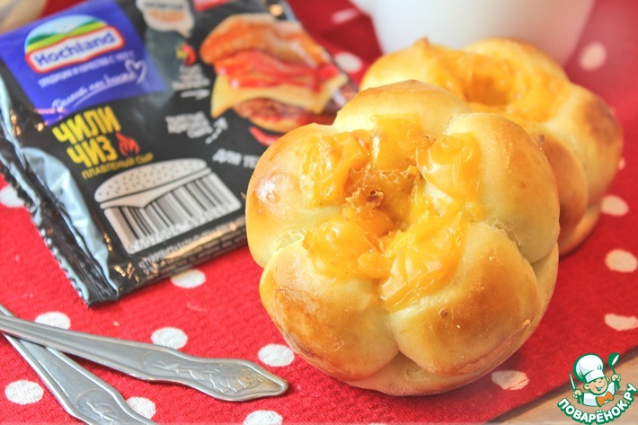 - Замесить дрожжевое тесто, используя заявленные ингредиенты. Тесту придать форму шара, уложить в чашку, накрыть и оставить для подъема на 1,5-2 часа в теплом месте. Поднявшееся тесто выложить на разделочную доску и хорошо обмять. Разделить тесто на 20 кусков массой по 10 грамм, которым придать форму «шара», и 4 куска по 20 грамм. Кусочек теста массой 20 грамм раскатать в круглый пласт. Уложить его в форму для выпечки, застеленную пергаментом. ! У меня форма диаметром 10 сантиметров. Затем выложить 5 «шариков» из теста, формируя «цветочек» как на фото. Таким же образом сформировать остальные булочки. Оставить на расстойку на 20 минут, накрыв формы чистым полотенцем. Смазать булочки взбитым желтком с молоком. Ломтик плавленого сыра Чили-Чиз ТМ Hochland освободить от упаковки. И разрезать на 4 равные квадратные части. Поместить кусочек сыра в серединку «цветка» - булочки. Выпекать булочки в духовке при 180 градусах около 20 минут. Готовые булочки достать из духовки, вынуть из формы и остудить. Разрезав булочку для бургера, соорудить на свой вкус сам бургер. Например, я вот такой соорудила. Приятного аппетита!