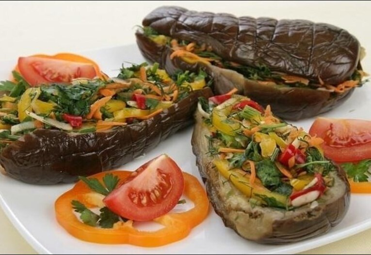 Соленые баклажаны с начинкой! Ингредиенты Баклажаны — 3-5 кг Морковь — 1 кг Сладкий перец — 300 гр. Чеснок — 30 гр. Петрушка — 2 пучка Укроп и сельдерей — по 1 пучку Горький перец — 1 стручок Соль — по вкусу Для заливки с водой : Уксусная эссенция - 1ч.л. Соль - 1 ч.л. 1. Баклажаны промыть, каждый овощ разрезать вдоль не до конца, чтобы раскрыть, как книжку. Выложить в кастрюлю с горячей водой, варить 5 минут. Откинуть на дуршлаг. Положить баклажаны на плоское блюдо, нак...