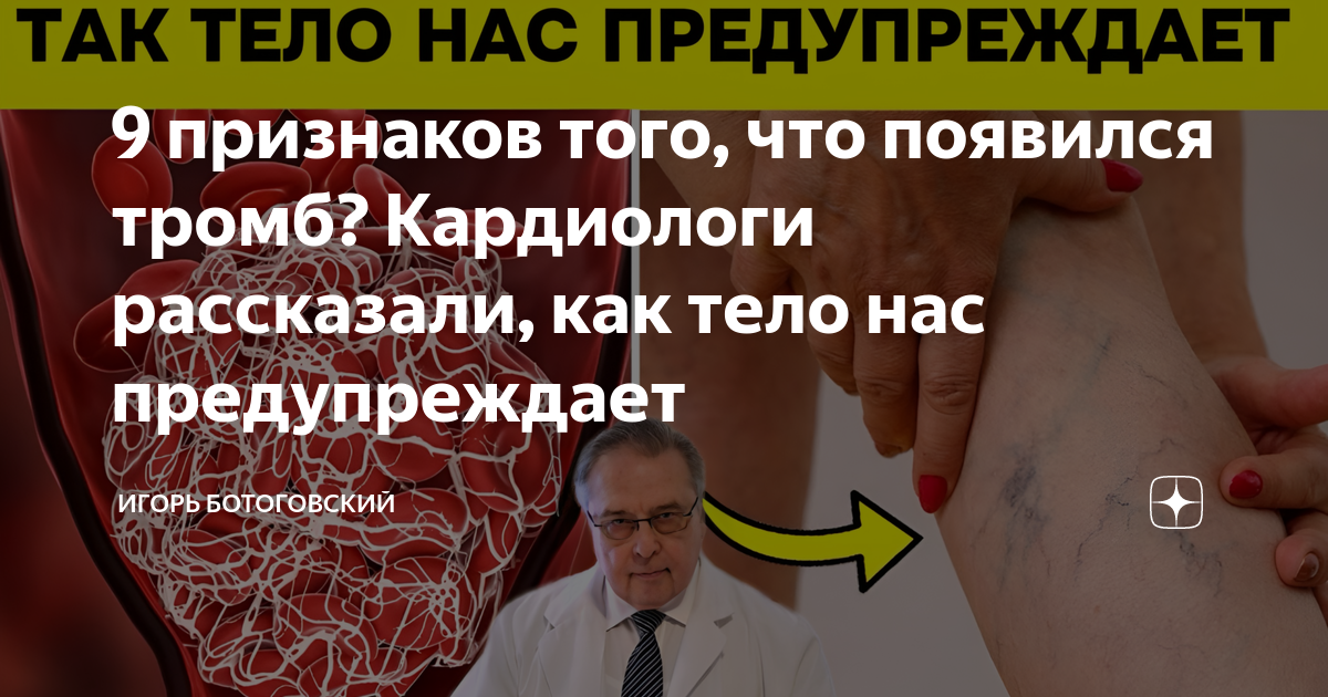 9 признаков того, что появился тромб? Кардиологи рассказали, как тело нас предупреждает Статья автора «Игорь Ботоговский» в Дзене ✍: Если попросить людей назвать самые распространенные причины смерти, вероятно, они назовут онкологию, сердечно-сосудистые заболевания и вспомнят об...