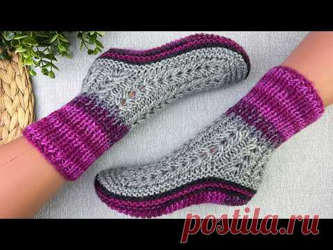 Домашние следки-носочки спицами. Простые следки спицами без швов на подошве.