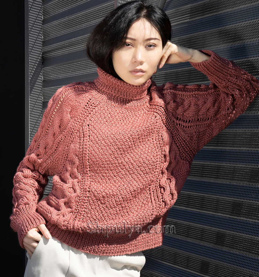 Вязаный свитер реглан с жемчужным узором и «косами». Размеры: S M L XL XXL. Обхват груди: 82–89 90–97 98–105 106–115 116–125 cм. Ширина переда и спинки изделия: 108 116 124 132 140 cм.