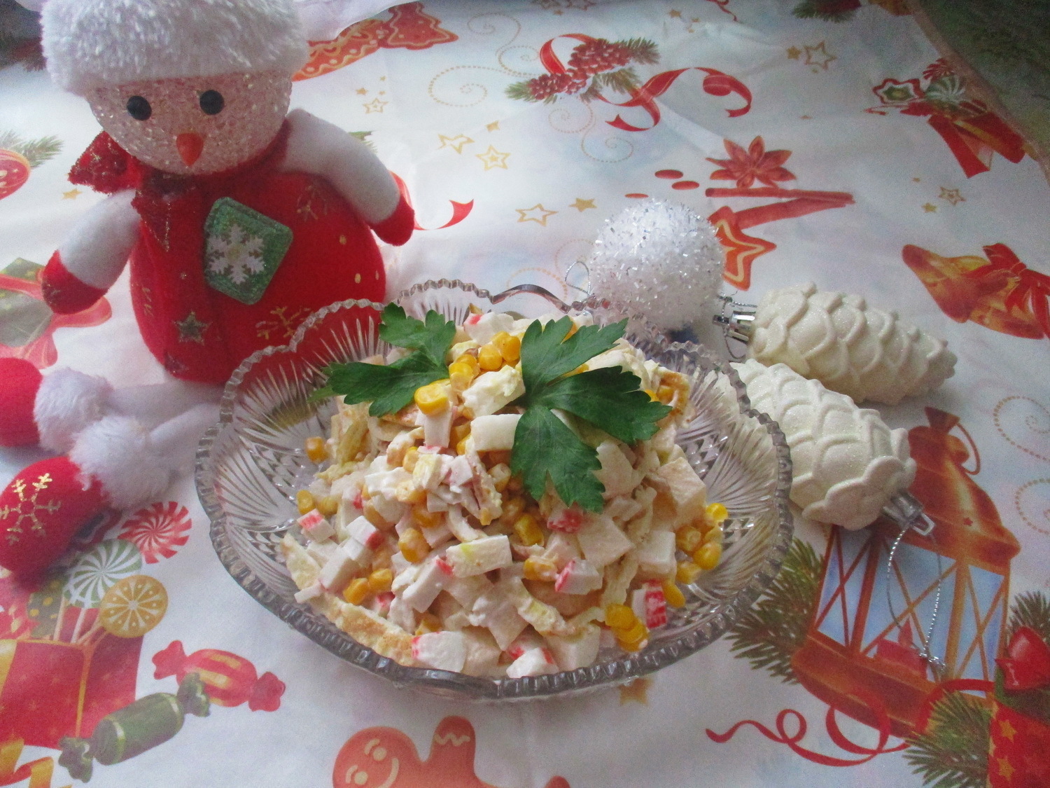 Салат снежок. Салат снежокВ миске смешать кукурузу и кубиком нарезанные крабовые палочки.Добавить кубиком нарезанное яблоко без кожуры.Яйца взбить в миске и немного посолить.На сковороде обжарить яичный блинчик с обеих сторон.Нарезать блинчик и добавить в миску к остальным ингредиентам.Заправить салат майонезомМожно подавать к столу!Приятного вам аппетита!Смотреть полную версию рецепта с ингредиентами