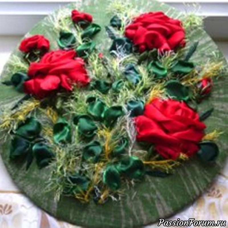 Розы | Вышивка лентами эту вышивку натянула на старую пластинку диаметр 30 см.