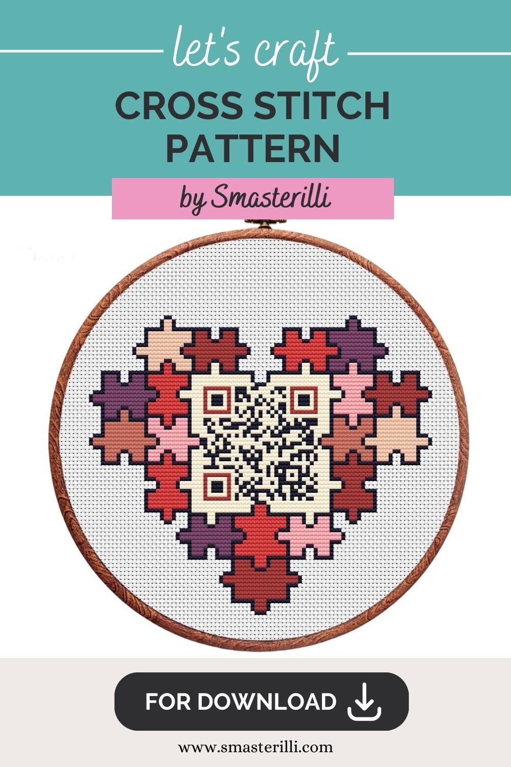 Heart cross stitch pattern with QR code , I love you phrase for Valentine's day gift by Smasterilli. Digital cross stitch pattern for instant download.