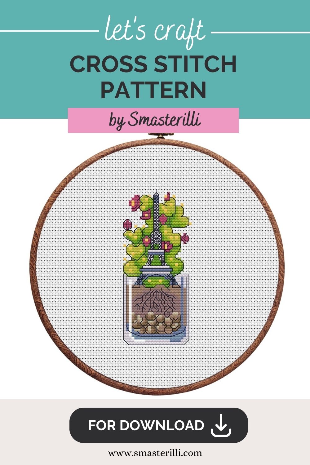 Potted cacti cross stitch pattern with Eiffel tower in the glass. Cute and easy embroidery ornament for beginners by Smasterilli. Digital cross stitch pattern for instant download. easy cross stitch for beginners