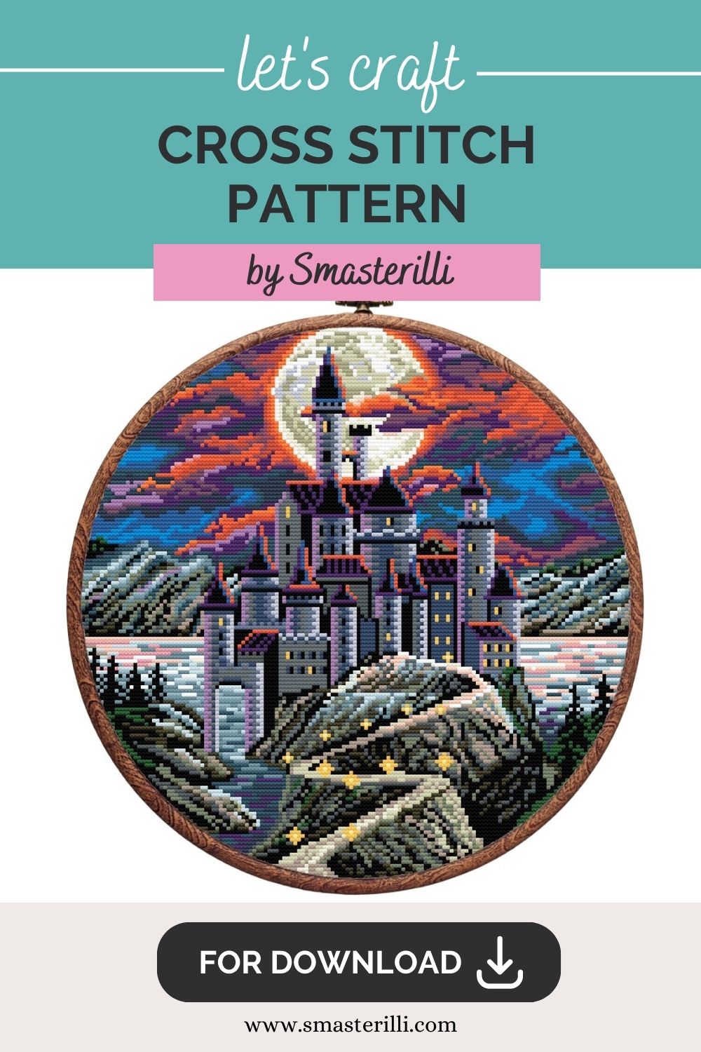 Dracula's castle cross stitch pattern. moon night landscape with vampire castle by Smasterilli. Digital cross stitch pattern for instant download. Medieval Castle Pattern. Enchanted Castle Embroidery