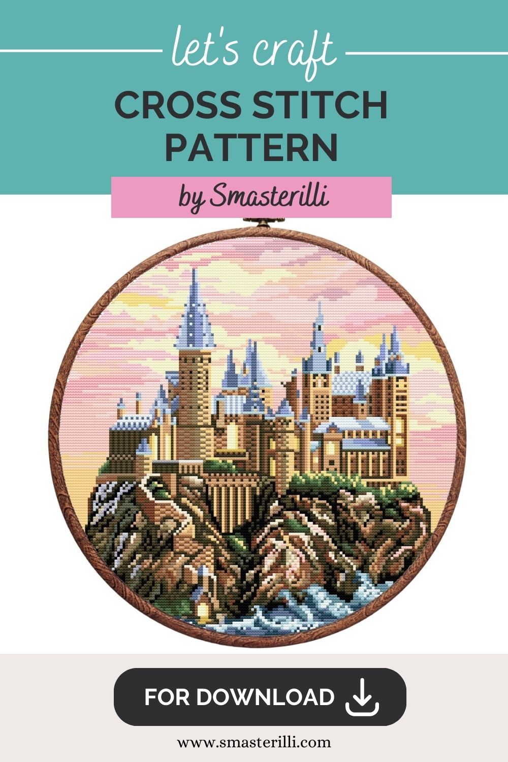 Hogwarts castle cross stitch pattern PDF , palace on sunset embroidery ornament by Smasterilli. Digital cross stitch pattern for instant download. Medieval Castle Pattern. Enchanted Castle Embroidery