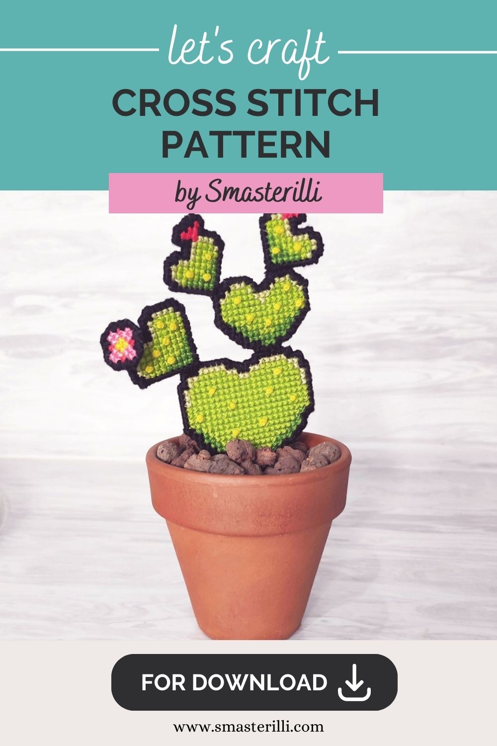 3D realistic potted cactus cross stitch pattern for plastic canvas. Pattern and detailed tutorial with photos and instructions by Smasterilli. Digital cross stitch pattern for instant download. Plastic Canvas Project.