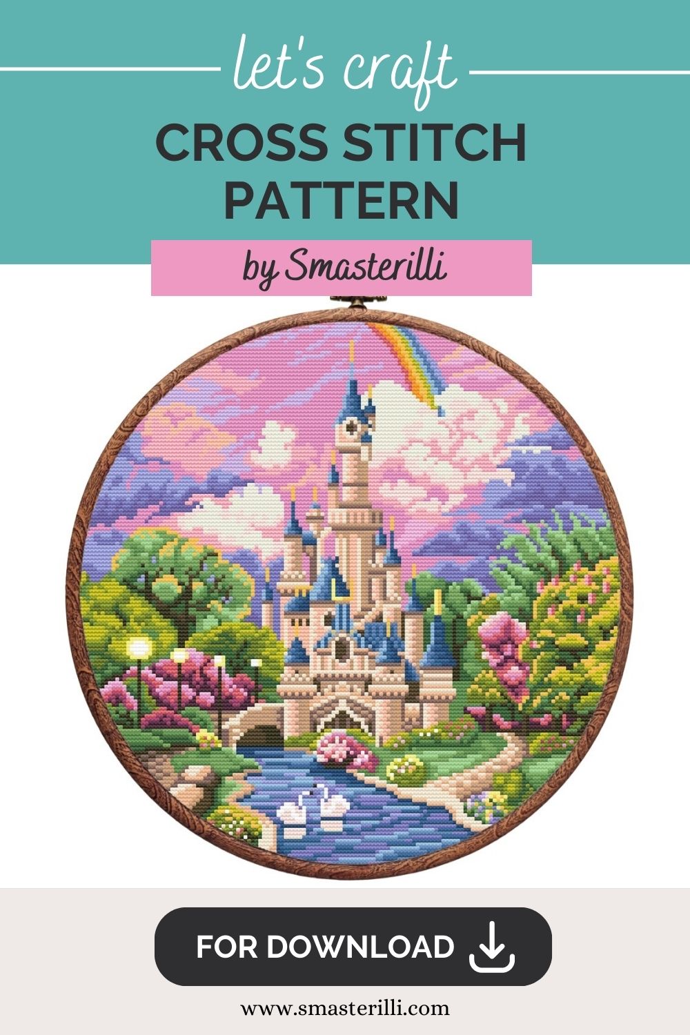 Fairy castle under rainbow cross stitch pattern PDF by Smasterilli. Digital cross stitch pattern for instant download. Medieval Castle Pattern. Enchanted Castle Embroidery