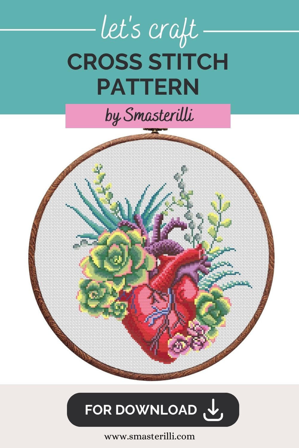 Anatomical heart cross stitch pattern with flowers and plants. Embroidery ornament by Smasterilli. Digital cross stitch pattern for instant download.