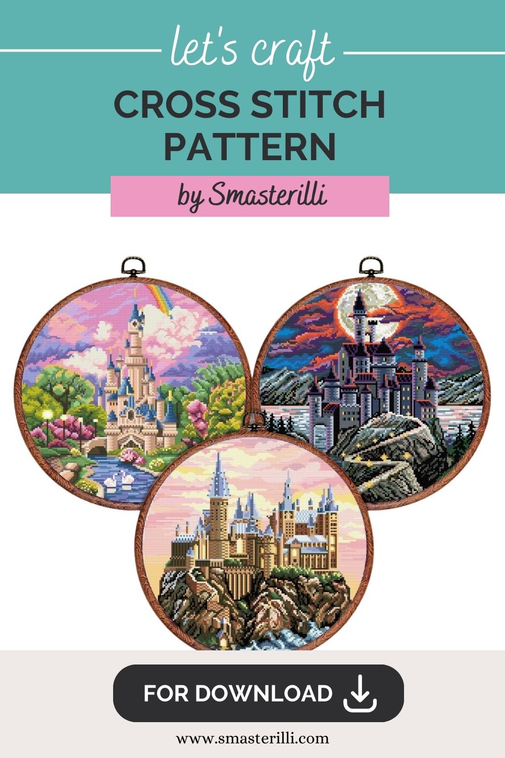 Fantasy castles cross stitch pattern PDF, set of three castles with landscapes. Digital cross stitch pattern for instant download. Medieval Castle Pattern. Enchanted Castle Embroidery