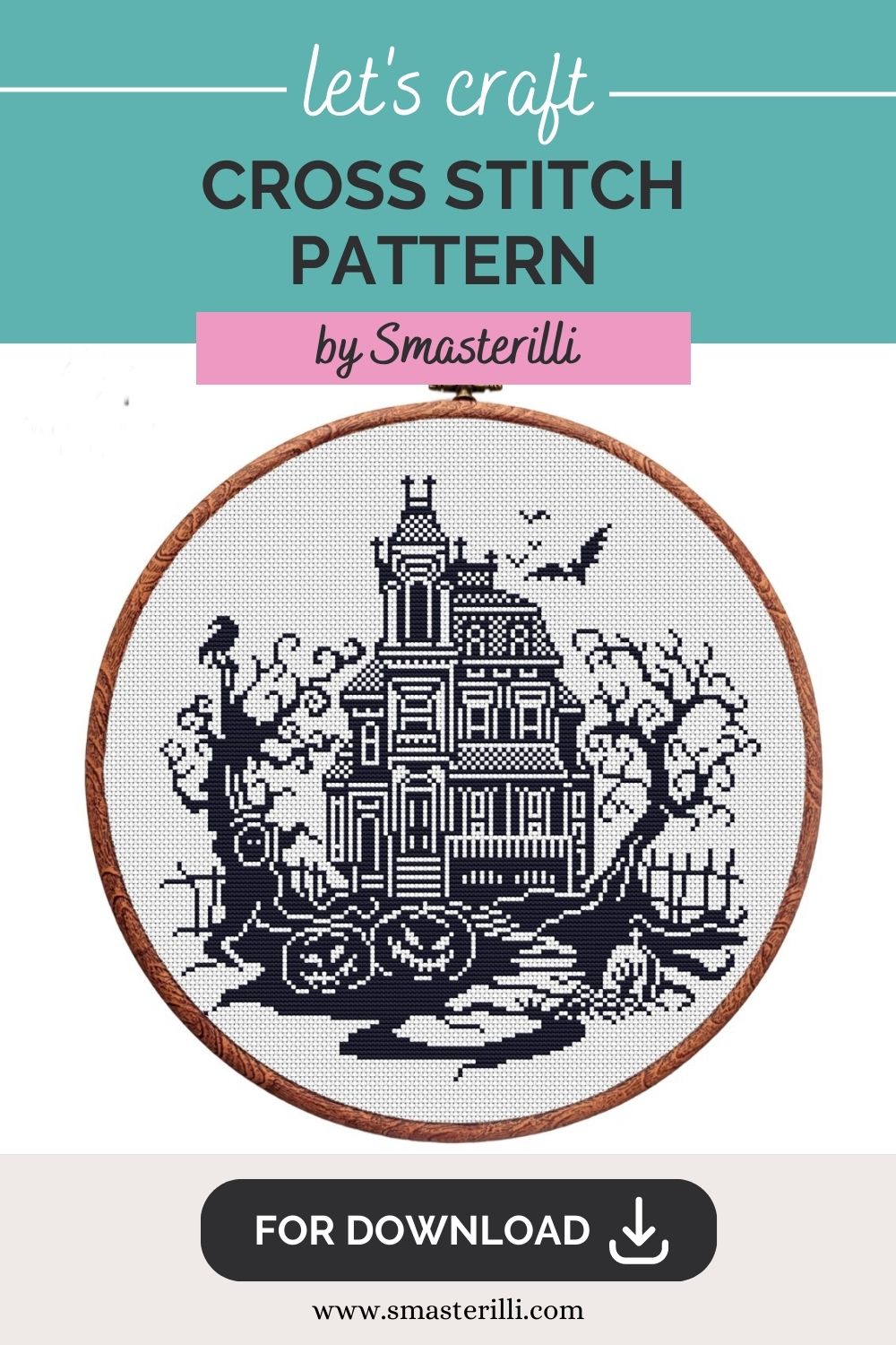 Spooky haunted house in monochrome cross stitch pattern by Smasterilli. Digital cross stitch pattern for instant download. Halloween handmade crafts