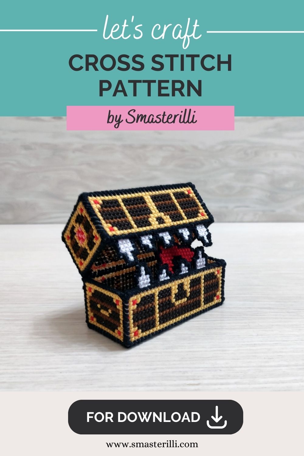 Mimic chest cross stitch pattern for plastic canvas by Smasterilli, 3D teethy box pattern and detailed tutorial with photos and instructions. Halloween handmade crafts. Plastic Canvas Project