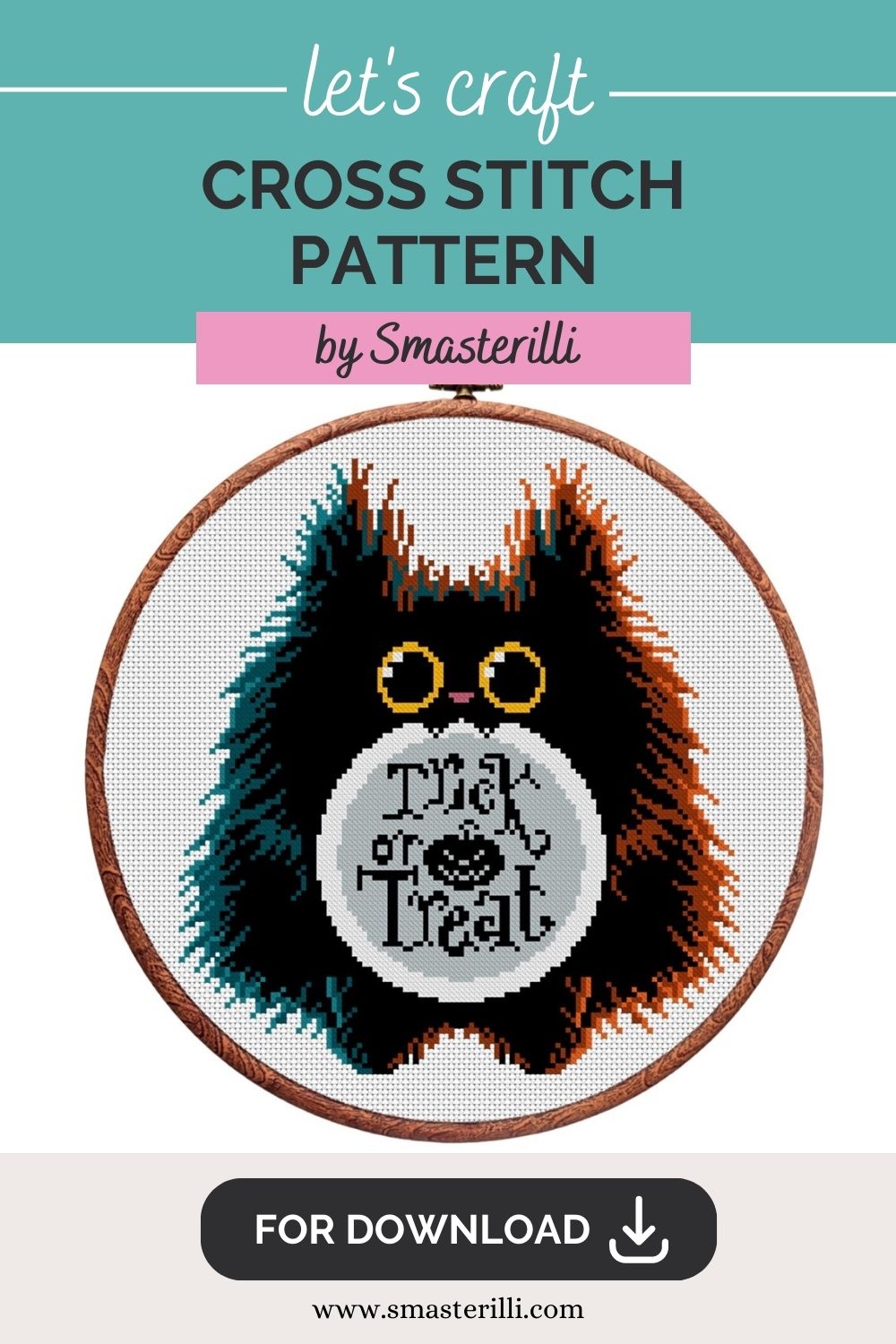 Black kitten with trick or treat inscription cross stitch pattern by Smasterilli. Digital cross stitch pattern for instant download. Cat Lover's Gift idea for handmade craft. Halloween handmade crafts