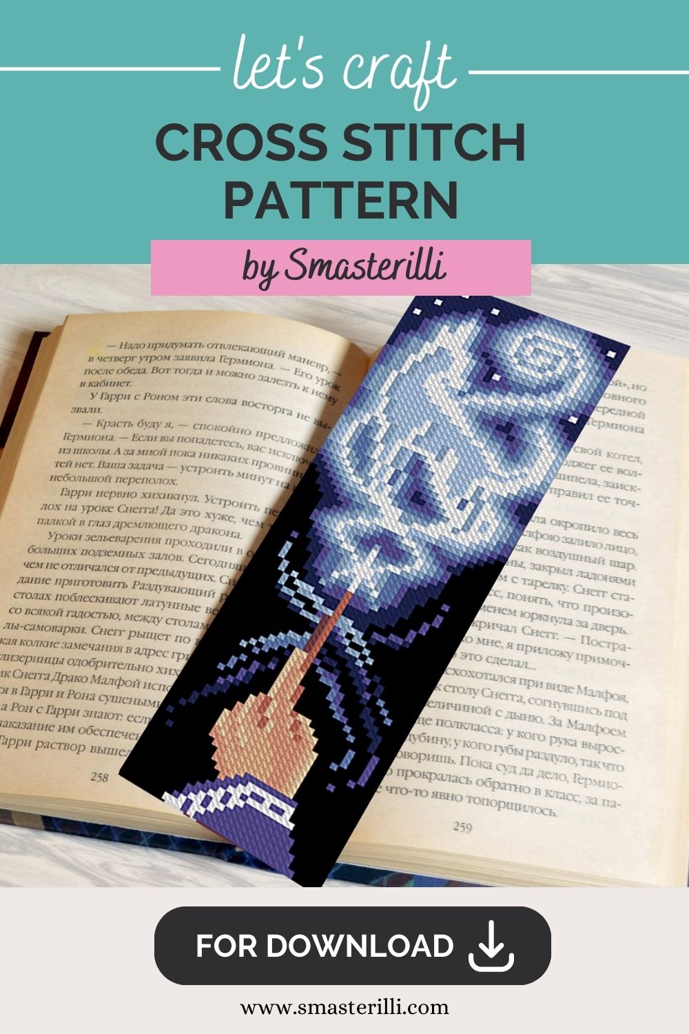 Magic wolf patronus bookmark cross stitch pattern PDF by Smasterilli. Digital cross stitch pattern for instant download. easy cross stitch for beginners. Book Lover's Craft