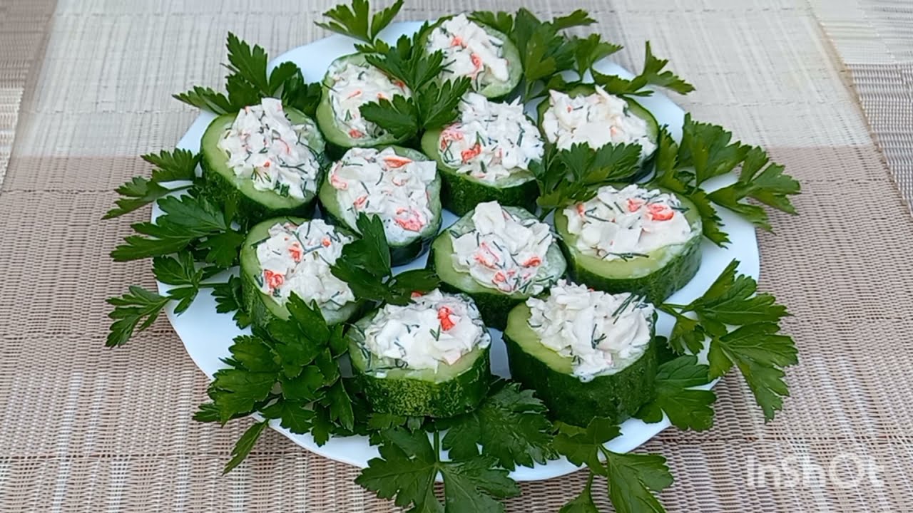 ОГУРЦЫ с начинкой Вкусная и оригинальная закуска рецепт:огурец свежийтворожный сыр3-4 зубчика чеснокакрабовое мясо 200грукроп