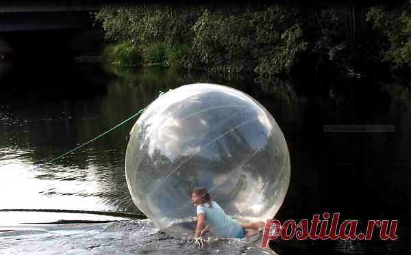 Огромный прозрачный пузырь с человеком внутри скользит по воде.