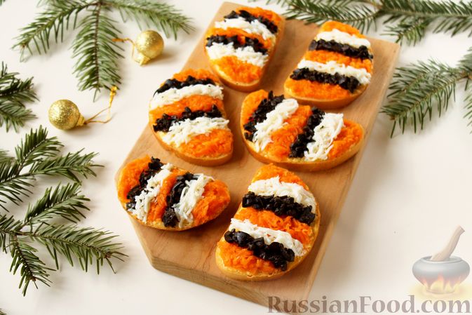 Рецепт: Новогодние бутерброды с сыром, морковью, яйцами и маслинами на RussianFood.com