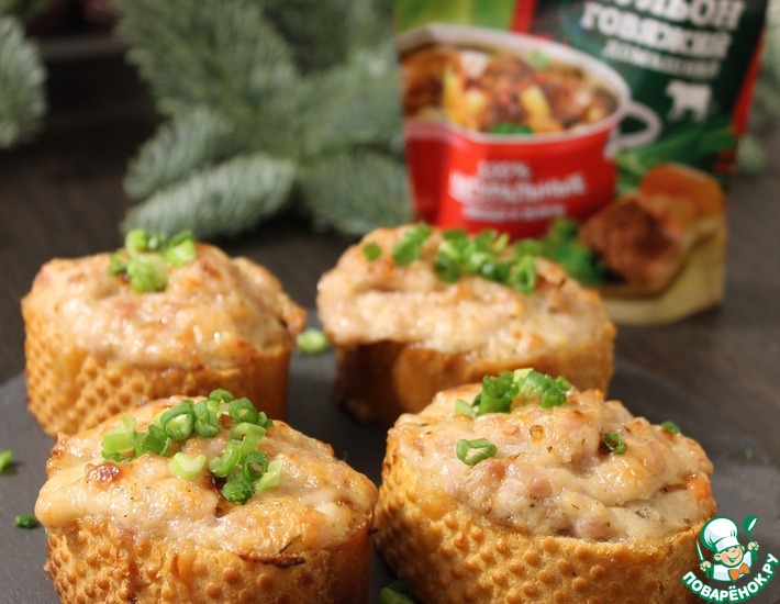 - Багет нарезать на одинаковые не очень тонкие кусочки. К фаршу добавить плавленный сыр и сухой говяжий бульон роллтон. Тщательно перемещать получившуюся массу. Важно: плавленный сыр не должен быть очень солёным! На каждый кусочек багета выложить начинку и отправить их в разогретую до 200 градусов духовку на 15 минут. Я ещё немного подержала кростини под грилем, чтобы шапочка аппетитно зарумянилась) Подавать сразу же, поспав мелко нарезанным зелёным луком. За идею рецепта спасибо Оксане (tasty_from_italy).