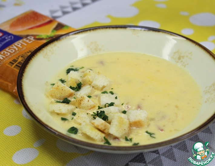 - Нарезать соломкой колбасу или бекон. Лук мелко порезать. На разогретой, сухой сковороде обжарить колбасу с луком до готовности. Снять с огня. Посыпать мукой. И очень хорошо перемешать. Подготовить сыр. Бульон довести до кипения и добавить сыр, мешая. Сыр очень быстро плавится. Добавить колбасу с луком. Варить 6-7 минут, помешивая. Снять с огня. Желток размешать и добавить, постепенно размешивая, 3-4 ложки супа. Влить в суп. Готово! Подавать с гренками и зеленью.