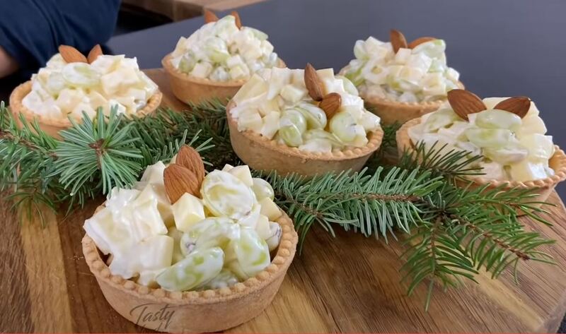 Салат Новогоднее Настроение в Тарталетках за (10) Минут Салат Новогоднее настроение подается в тарталетках. В нем сочетаются соленый сыр, сладкие ананасы и виноград. Готовится за 10 минут