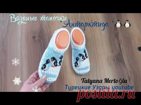Вязаные тапочки "Антарктида"🐧🐧 тунисское вязание +спицы 🤍🩵