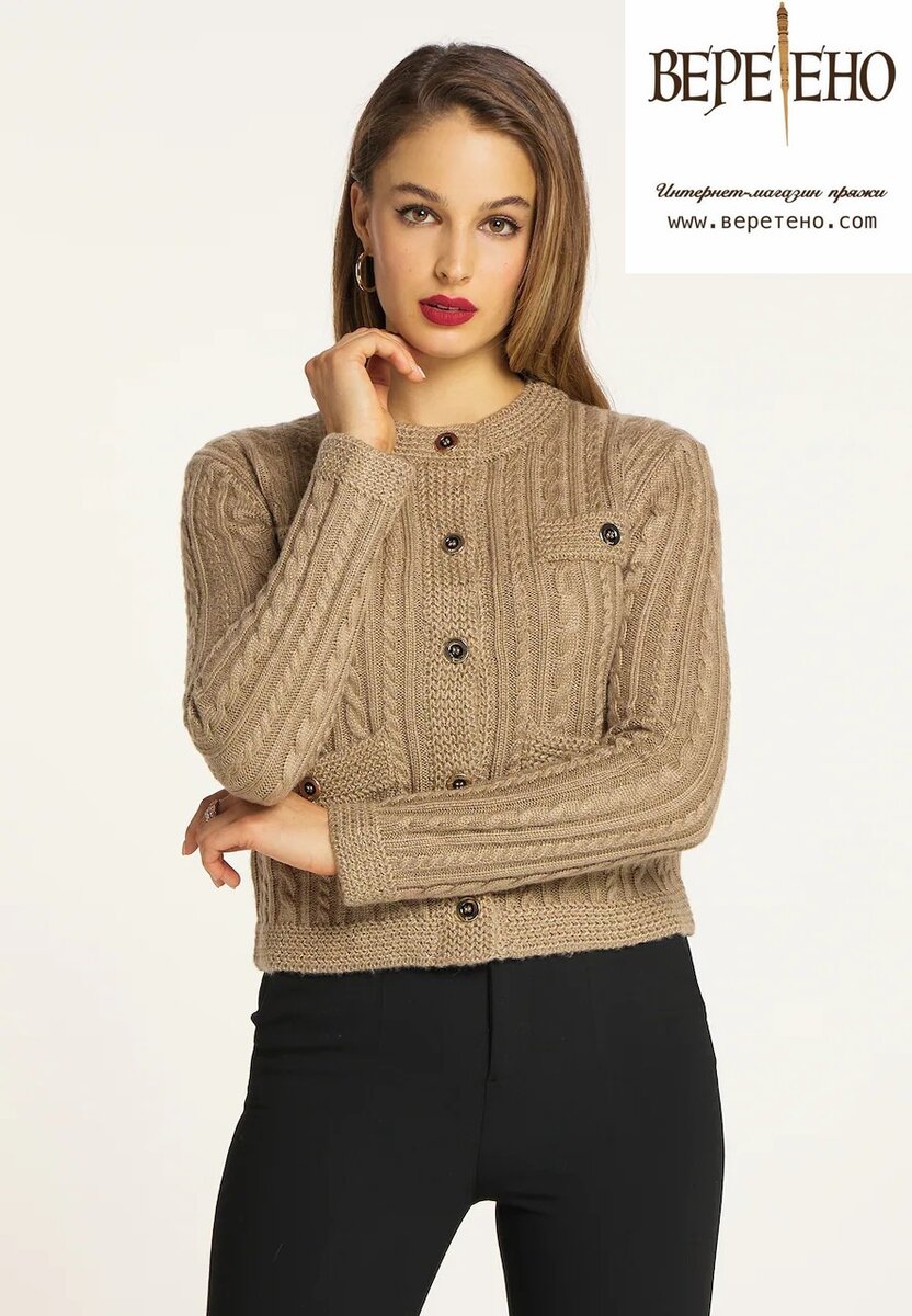 Кардиган темно-бежевого цвета в стиле “шанель” с застежкой на пуговицы (схема узора)