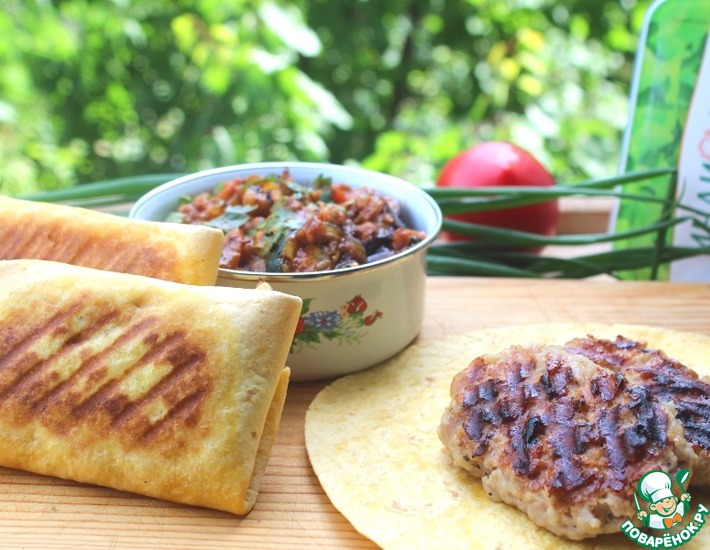 - В томатный сок или краснодарский соус выдавить чеснок, добавить сахар, соль, жгучий перец и немного порезанной зелени. Перемешать. Баклажаны и цуккини порезать кольцами. Томаты разрезать пополам. Перцы порезать крупными дольками. Все, кроме томатов, сложить в емкость, влить растительное масло, закрыть крышкой и хорошо потрясти. Слегка посолить овощи и запечь на гриле - я запекала все по отдельности. По мере запекания, складывать овощи в соус. Помидоры и перец очистить от кожицы. Посыпать оставшейся зеленью, закрыть крышкой и легко потрясти. Выложить овощи на блюдо для подачи. Достать котлеты из упаковки. Я немного прокатала каждую котлету между ладонями - чтобы не обжаривать с 4 сторон. Смазать гриль и выложить котлеты. У меня электрический гриль. Если готовите на открытом гриле то котлеты слегка приплюснуть. Очень удобно подавать котлеты в лепешке. На лепешку посередине выкладываем пластину сыра. На него котлету. На котлету сыр и заворачиваем конвертиком. Прижариваем на гриле. Подаем с острыми овощами-гриль.